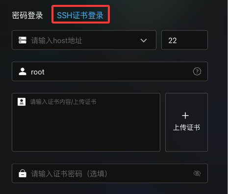 2?? 證書登錄: 上傳或選擇本地已配置的 SSH 私鑰文件進行連接。