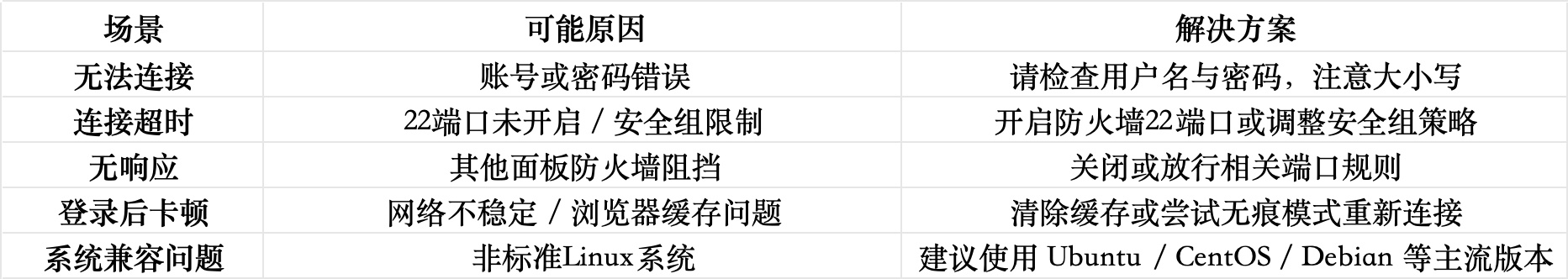 解答:檢查服務器IP、防火墻、端口是否開放;確認賬號密碼正確。