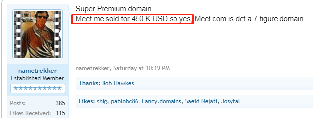 最近,海外論壇namepros.com上有網友@Saeid Nejati曝料稱:域名meet.com以及以7位數美金的價格出售了!這可能非常適合社交或相親約會網站。