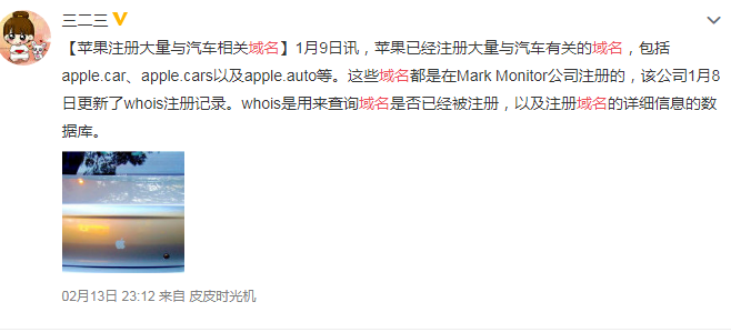 近日,有網(wǎng)友在微博曝料,蘋果注冊(cè)大量和汽車有關(guān)的域名,像apple.car、apple.cars、apple.auto等,這些域名都是在Mark Monitor公司注冊(cè)的,注冊(cè)時(shí)間顯示為1月8日。